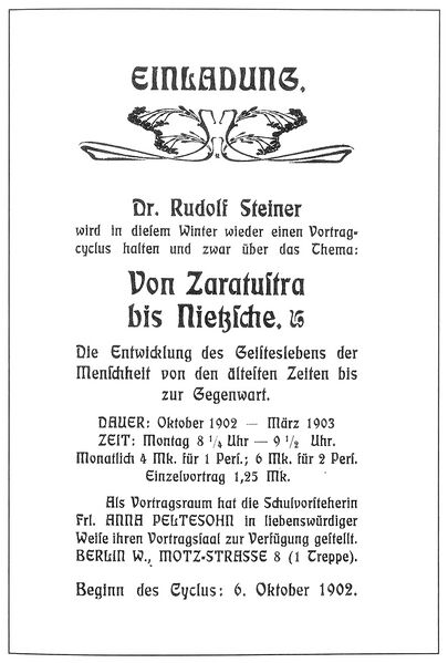 Programm von Rudolf Steiners Vortragsreihe «Von Zarathustra bis Nietzsche», 1902
